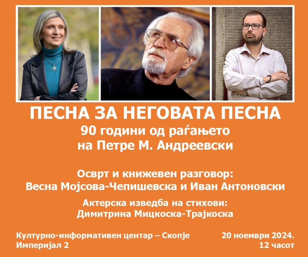 A special event was held on 20.11.2024 to celebrate the 90th anniversary of Petre M. Andreevski’s birth at the Cultural Information Center in Skopje. The event, titled “Song for His Song,” highlighted his influential role in Macedonian literature. Prominent figures, including Professor Vesna Mojosova-Čepişevska, discussed his poetic legacy, focusing on the visual imagery and themes in his works, such as Denicija and Pirej. Performances and archival materials added a deeper connection to his enduring impact on Macedonian culture.